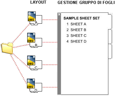 - Per gruppo di fogli si intende una raccolta con nome organizzata di fogli provenienti da diversi file di disegno. È possibile gestire, trasmettere, pubblicare e archiviare i gruppi di fogli come singola unità.