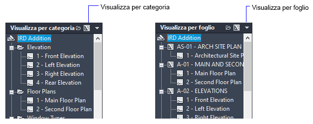 - Le categorie vista sono spesso associate ad una funzione. È ad esempio possibile utilizzare rispettivamente le categorie vista Prospetti in architettura e Viste esplose in progettazione meccanica. È possibile visualizzare le viste in base alla categoria oppure al foglio su cui si trovano. Le categorie possono essere nidificate in altre categorie in base alle necessità. Per spostare una vista in una categoria diversa, trascinarla nella struttura oppure utilizzare l'opzione del menu di scelta rapida Imposta categoria.