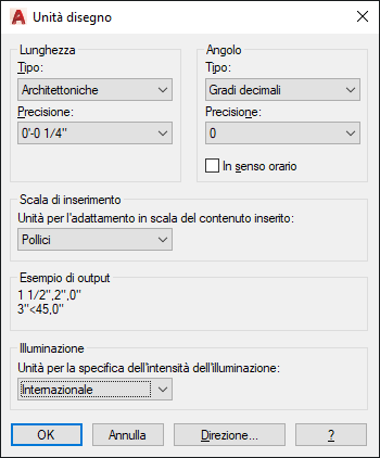 che include Architettonico, Decimale, Ingegneristico, Frazionario e Scientifico. I formati Ingegneristico e Architettonico producono visualizzazioni in piedi e pollici e presuppongono che ogni unità di disegno equivalga ad un pollice. Gli altri formati possono rappresentare qualsiasi unità di misura reale.