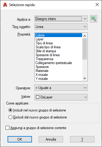 Se è stato selezionato Aggiungi a gruppo di selezione corrente, i criteri di filtraggio vengono applicati all'intero disegno.
