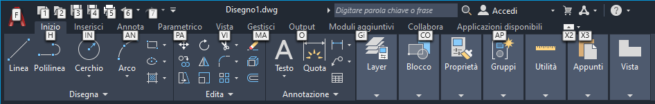 È possibile utilizzare i tasti anziché il dispositivo di puntamento per effettuare selezioni nei menu, sulla barra degli strumenti Accesso rapido e sulle barre multifunzione. Per verificare i tasti disponibili nell'area di lavoro corrente, premere ALT.