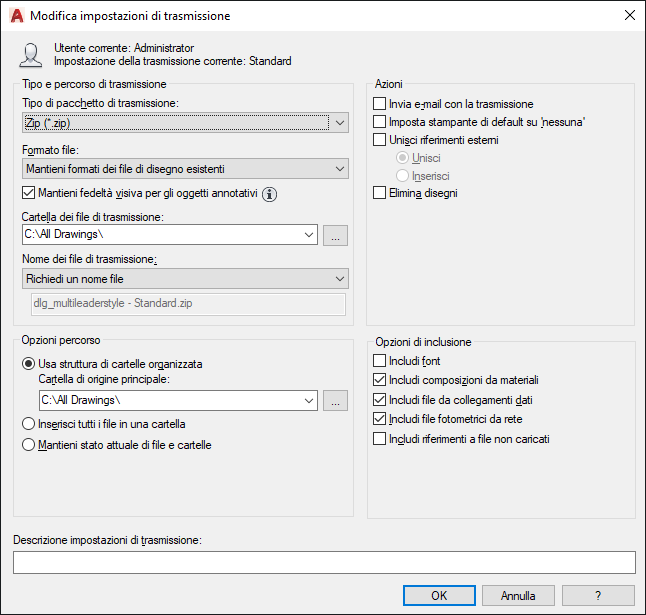 Se il campo dati viene lasciato invariato, il file di trasmissione viene creato nella cartella contenente il primo file di disegno specificato. Nel contesto di un gruppo di fogli, il file di trasmissione viene creato nella cartella contenente il file di dati del gruppo di fogli (DST). Questa opzione non è applicabile ad AutoCAD LT.