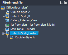 Il disegno corrente è sempre visualizzato al livello superiore della vista struttura. I file di riferimento appaiono al livello successivo. È possibile aprire i file di riferimento che contengono riferimenti file nidificati per visualizzare i livelli successivi di nidificazione. Nella modalità di visualizzazione struttura è possibile selezionare solo un riferimento file alla volta.
