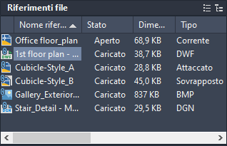 La colonna del nome del riferimento riporta sempre il disegno corrente come prima voce, seguita dagli ulteriori file nell'ordine con il quale sono stati associati.
