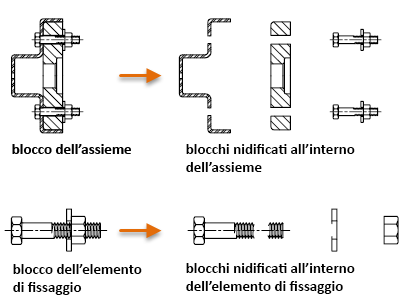 I riferimenti di blocco che sono inclusi in una definizione di blocco vengono denominati blocchi nidificati. Utilizzando dei blocchi all'interno di blocchi è possibile semplificare l'organizzazione di una definizione di blocco complessa.