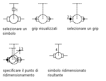 Di seguito, a scopo esemplificativo, è indicata la procedura per ridurre le dimensioni di un simbolo schematico tramite la modalità di grip Scala e specificarne le nuove dimensioni mediante trascinamento. I numeri in parentesi sono riferiti alle illustrazioni riportate dopo la procedura.