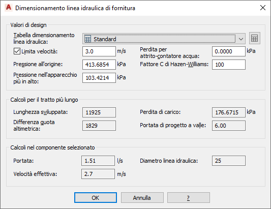 I calcoli finali sono visualizzati in due sezioni della finestra di dialogo Dimensionamento linea idraulica di fornitura: