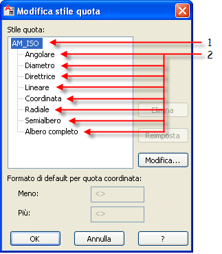 Gli stili di quota associati alle norme di disegno sono costituiti da uno stile di quota di base (1 nella figura), che definisce le impostazioni di base correlate alle norme, e da stili secondari (2 nella figura), che definiscono in modo esplicito gli stili per i diversi tipi di quota. Nella maggior parte dei casi, gli stili secondari sono identici allo stile di base. In alcuni casi, quando è necessario applicare un'unica caratteristica a un tipo di quota, le impostazioni di default per lo stile di quota includono almeno un'impostazione diversa dallo stile di quota di base.