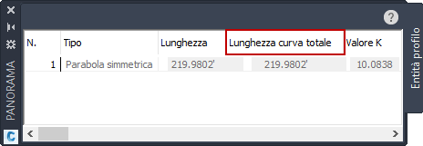 Il valore Lunghezza curva totale mostra la lunghezza raccordo altimetrico totale, mentre la proprietà Lunghezza mostra la lunghezza della parte risolta della geometria della curva, ad esempio quando le tangenti sono collegate lungo le curve.
