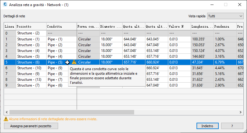 Quando si seleziona una riga nella tabella dei risultati, il riquadro a destra mostra informazioni dettagliate sulla condotta e sul pozzetto nella linea selezionata.