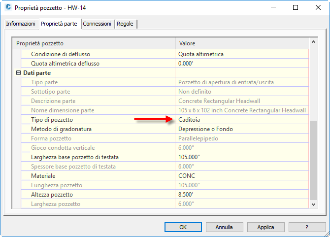 Le impostazioni di default per i pozzetti possono essere specificate nella finestra di dialogo Modifica impostazioni oggetti - Pozzetto .