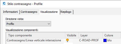 Stili contrassegno vengono utilizzati per controllare l'aspetto di oggetti intersezione in viste profilo. L'aspetto dello stile contrassegno viene controllato nella scheda Visualizzazione della finestra di dialogo Stile contrassegno. Selezionare Profilo dall'elenco Direzione vista per esaminare e modificare il modo in cui lo stile contrassegno è configurato per la vista profilo. Esiste un singolo componente che controlla la visualizzazione del contrassegno (che viene utilizzato per visualizzare profili intersezione, linee caratteristiche, figure di rilievo e polilinee 3D) e della linea verticale intersezione (che viene utilizzata per visualizzare tracciati intersezione).