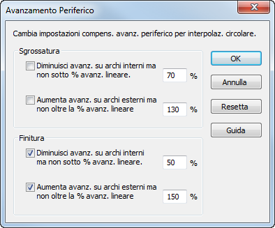 Selezionare Aumenta avanzamento su archi esterni per aumentare la velocità su movimenti convessi. Impostare il limite superiore inserendo una percentuale dell'avanzamento lineare.