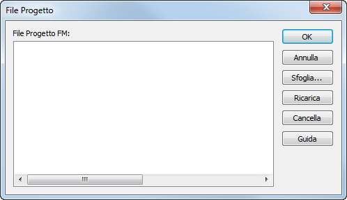Cancella — Elimina il file progetto selezionato dall'elenco File progetto FM. Questa opzione non è disponibile per file progetto che vengono al momento usati da un documento con più origini.