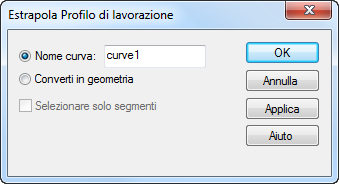 La finestra di dialogo Estrapola profilo di lavorazione permette di creare una curva da un percorso utensile. Se si vuole creare una singola curva, inserire il nome per la curva e fare clic su OK. Se si vogliono creare archi e linee, fare clic sulla geometria Converti. Se si vogliono elaborare solo alcuni segmenti di un percorso utensile, selezionare una serie di movimenti e selezionare l'opzione Solo segmenti selezionati.