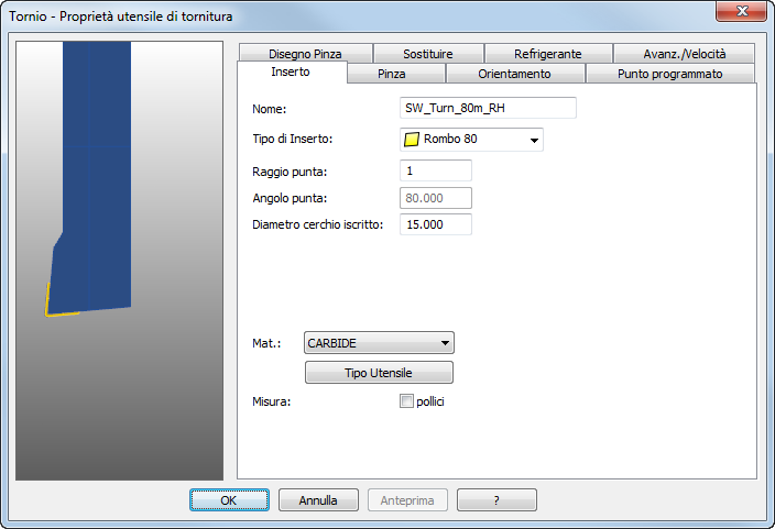 Tipo inserto — Selezionare la forma dell'inserto. Per la formaDiamante personalizzato è necessario immettere Angolo punta.