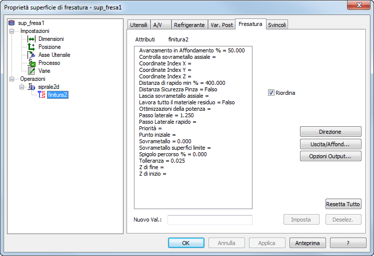 Sovrametallo finitura — Inserire la quantità di materiale da lasciare dopo una passata di finitura. Si può inserire un valore positivo o negativo. Si può inserire un numero negativo, fino al valore negativo del raggio dell'utensile, per permettere la riduzione del volume o lo spazio della scintilla, e la parte è lavorata in superfici, del valore negativo specificato. Se non viene impostato alcun valore, il Sovrametallo è come impostazione predefinita uguale a 0.