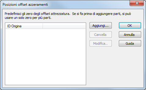 Si può usare la finestra di dialogo Posizioni offset azzeramenti per creare, modificare ed eliminare origini in un documento con più azzeramenti.