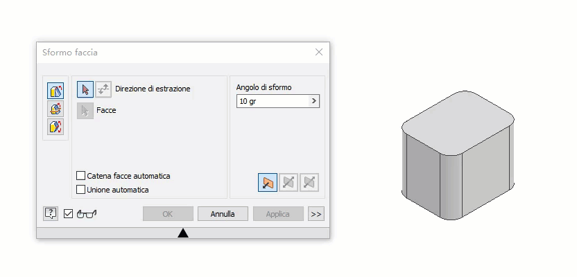 Come utilizzare Catena facce automatica e Unione automatica con sformo faccia