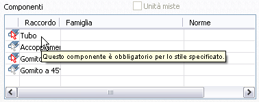 La tabella dei componenti presenta un insieme base di componenti per lo stile che si sta visualizzando o creando. I simboli indicano se il componente è facoltativo o necessario e se si riscontrano problemi con esso. Quando si posiziona il cursore sul simbolo viene visualizzata una descrizione.