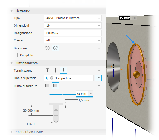 Filettature viene attivato quando è selezionato il tipo di foro Filettato o Filettato conico. Specificare i parametri del foro: