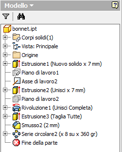 Visualizza informazioni dettagliate sulle lavorazioni di parti nel browser. Nomi estesi delle lavorazioni sono disponibili negli ambienti delle parti, delle parti in lamiera, di disegno e nella vista di modellazione di assiemi.