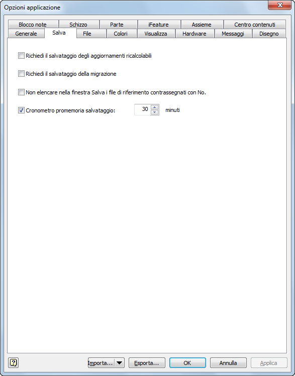 Nella finestra di dialogo Opzioni applicazione, scheda Salva, è possibile impostare le opzioni per richiedere il salvataggio e la migrazione dei vecchi file di Inventor quando vengono aperti e chiusi.
