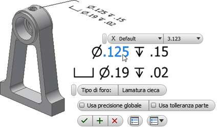 - Fare doppio clic sulla nota relativa a foro/filettatura nella visualizzazione o nel browser.