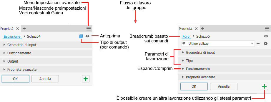 I gruppi Proprietà forniscono accesso contestuale ai parametri utilizzati per la creazione e la modifica di lavorazioni.