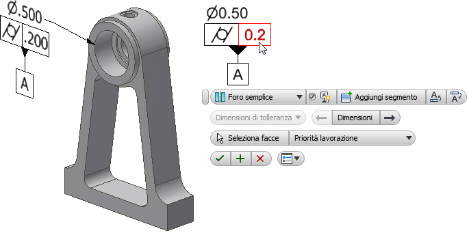 Nota: Il comando Lavorazione di tolleranza rileva automaticamente quote schizzo o lavorazione associate create sul modello. Il comando implicitamente promuove la quota tolleranza durante la creazione di una lavorazione di tolleranza.