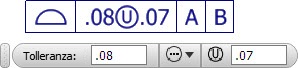 Il valore di tolleranza profilo nel riquadro di controllo della geometria è la larghezza totale della tolleranza di profilo. Il valore che segue il simbolo "disposta in maniera non uniforme" è la quantità di tolleranza che consente di aggiungere materiale dal valore nominale.