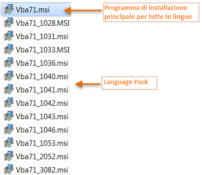 - Vba71.msi è il programma di installazione principale per tutte le lingue. Gli altri programmi di installazione sono i Language Pack. Per individuare il Language Pack corretto per la propria lingua, consultare https://msdn.microsoft.com/en-us/library/ms912047(v=winembedded.10).aspx Se possibile, fare clic con il pulsante destro del mouse sul programma di installazione appropriato e selezionare Installa.