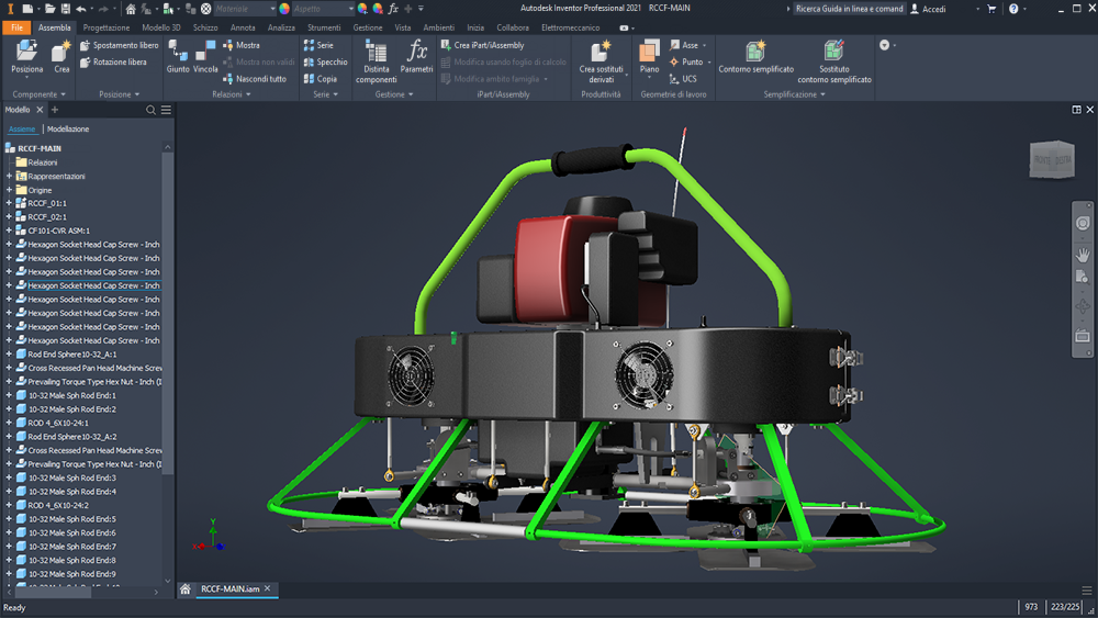 Il tema Scuro (versione preliminare) di Inventor è caratterizzato da un'interfaccia utente blu scuro con uno schema colori complementare.