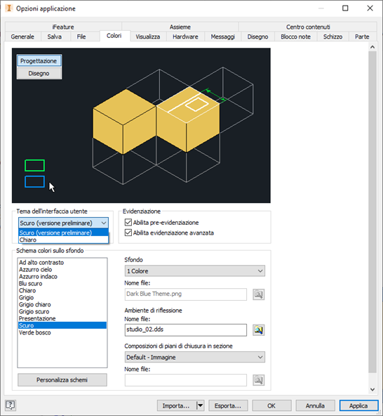 - L'elenco Tema dell'interfaccia utente viene visualizzato per primo nei controlli della scheda Colori, poiché il tema influisce sui valori dello schema colori. Sarà opportuno verificare gli schemi colori con il nuovo tema.