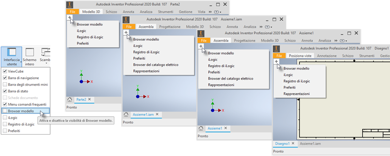 - Gruppi. Ogni gruppo può essere spostato all'interno, aggiunto a o rimosso da un gruppo esistente trascinando la scheda. I gruppi possono anche essere agganciati affiancati, dall'alto verso il basso o sganciati e muoversi separatamente e persino agganciati al di fuori di Inventor.