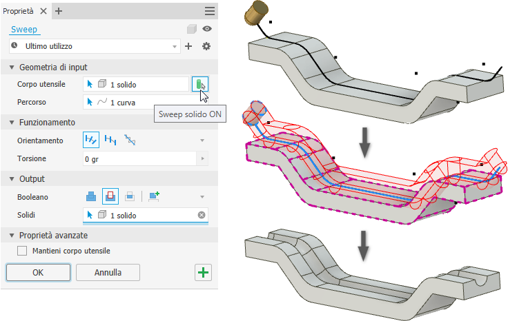 Oltre al gruppo Proprietà, il comando Sweep supporta ora l'estrusione di un solido.
