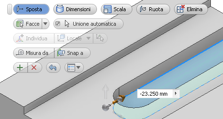 Modifica diretta, era solo possibile ruotare o spostare una lavorazione della faccia in un'altra posizione. Quando è deselezionata, Unione automatica consente di mantenere questo comportamento e di spostare la faccia in una nuova posizione. Quando è selezionata, la lunghezza totale di una lavorazione della faccia viene modificata.