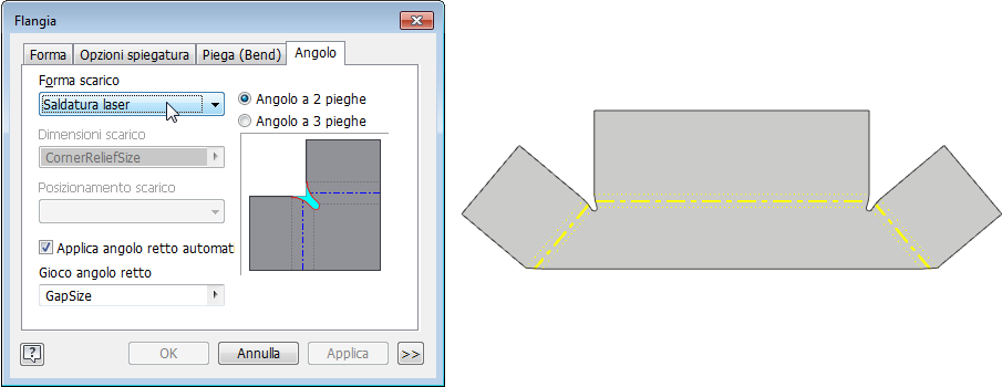 Lo scarico d'angolo della saldatura lineare termina su un punto, la forma di scarico d'angolo della saldatura ad arco termina con un segmento di linea retta. Il nuovo scarico d'angolo della saldatura al laser termina con un arco di tangente ed è più adatto alle parti tagliate al laser.