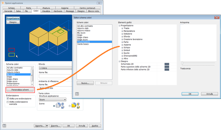 L'editor Schema colori viene installato come parte di Inventor 2019. È possibile accedervi da Opzioni applicazione > scheda Colore. Le personalizzazioni vengono salvate nel file .xml delle Opzioni applicazione.