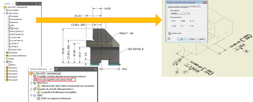 Definizione basata su modelli (MBD), è un nuovo potente set di strumenti per l'aggiunta di annotazioni, quotature e tolleranze geometriche e altre informazioni di produzione direttamente in una parte 3D. Verifica tolleranza integrata monitora lo stato del piano di tolleranza ed elenca i potenziali problemi, errori e altre informazioni nel browser Verifica tolleranza. Quando il modello 3D presenta una Definizione basata su modelli e annotazioni 3D applicate è possibile ripristinare il disegno 2D ed esportare in formato PDF 3D o STEP AP242.