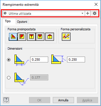 Per ulteriori informazioni sulle opzioni Angolo retto e Incavo, vedere Modifica o applicazione dei trattamenti estremità ai telai.