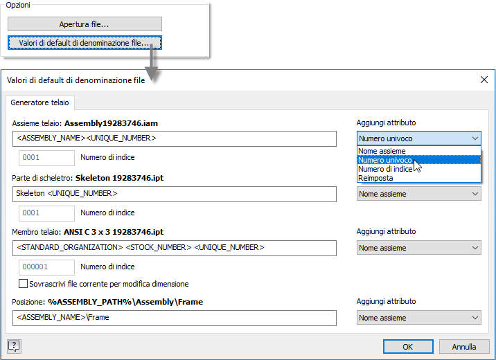 Nella finestra di dialogo Valori di default di denominazione file, fare clic sugli elenchi a discesa Aggiungi attributo per configurare lo schema di denominazione.