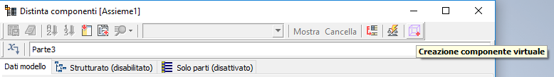 Utilizzare la nuova opzione Creazione componente virtuale per creare un componente virtuale dalla finestra di dialogo Distinta componenti. Il componente virtuale viene visualizzato nella parte inferiore del Browser assiemi.