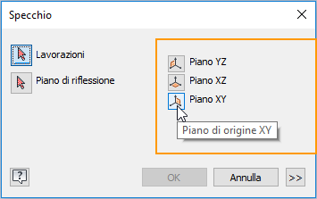 Le opzioni del piano di lavoro nella finestra di dialogo Specchia parte, disponibile nella scheda Modello 3D