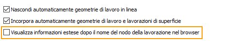 Le opzioni Visualizza informazioni estese dopo il nome del nodo della lavorazione nel browser (disponibile in Opzioni applicazione/scheda Parti) e Mostra nomi estesi (disponibile nel menu Strumenti del Browser modelli) sono stati migliorati per supportare i seguenti comandi: