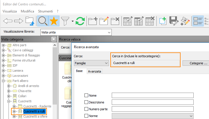 che si trova sul lato destro del campo di ricerca. Quando si cancella il campo di ricerca, l'editor torna alla categoria precedentemente selezionata nella Struttura della categoria.