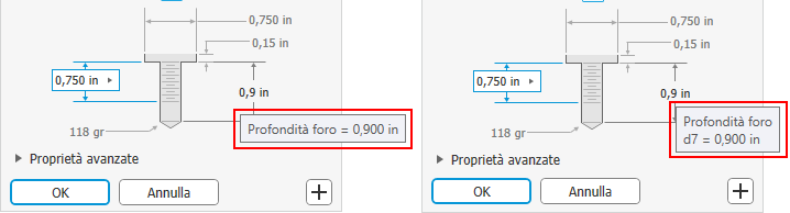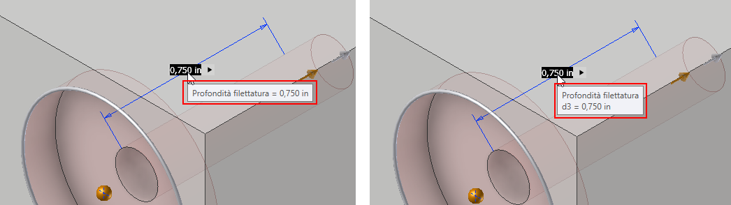 Per il comando Foro, quando un valore non è valido, ad esempio, la lunghezza del filetto è maggiore della profondità del foro, il colore del valore diventa rosso e la descrizione del comando mostra che il valore non è valido quando si sta digitando il valore. Ciò consente di correggere immediatamente il valore o individuare un altro valore che necessiti di una modifica per essere valido. Quando il valore è valido, il valore è di colore nero.