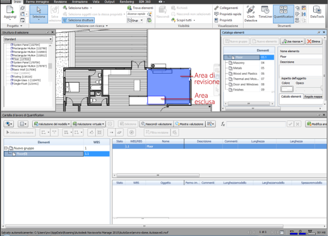 La funzionalità Area esclusa consente di ritagliare elementi della geometria. Disegnando un'area esclusa, si esclude una parte della valutazione ad area esistente. Le aree escluse risultano ad esempio utili quando si contrassegna l'area del pavimento per la valutazione, ma si desidera escludere dalla valutazione una sezione di tale area, come un corridoio. L'area esclusa del corridoio viene quindi "sottratta" dall'area del pavimento nella cartella di lavoro di Quantification.
