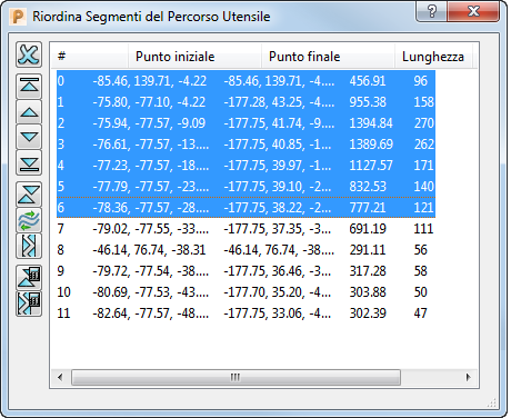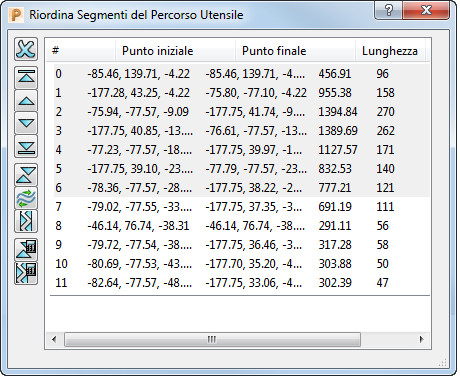 Questa finestra di dialogo visualizza tutti i segmenti del percorso utensile e permette di riordinarli, alterando l'ordine di lavorazione.