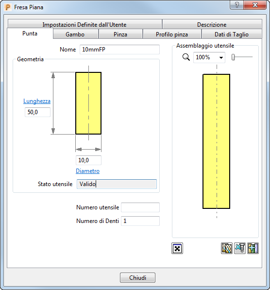 È possibile modificare i campi bianchi, ma non quelli grigi. I campi modificabili dipendono da se l'utensile è stato usato o meno nel percorso utensile. Se è stato usato, allora non è possibile modificare l'utensile, il gambo o la geometria della pinza. Se l'utensile non è ancora stato usato per creare un percorso utensile, si possono modificare tutti i campi.